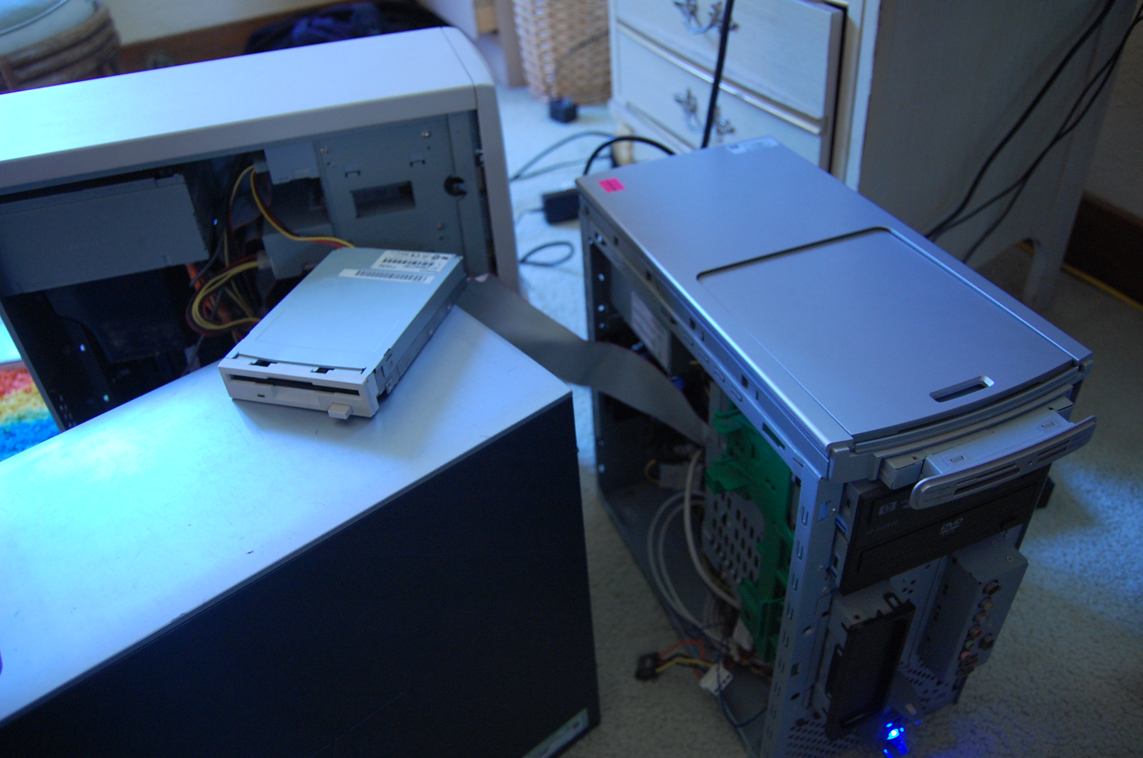 Please observe that the power cord of the floppy disk is coming from a computer (let’s call it A) and the actual IDE connector comes from the actual computer (let’s call it B) where I was trying to reinstall Windows XP on. I was able to change the IDE cable with a floppy connector on computer B but I didn’t really feel like exchanging the power supply so I used the power supply of the computer A. It’s the first time I see a floppy installed on a computer but powered by another.